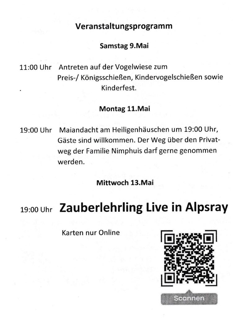 Unser öffentliches Lokal “ to hoop“ wird von einem Pächter betrieben. Bei allen Aktivitäten kann man auf einen großen Teil von ehrenamtlichen Helfern der ca.350 Mitglieder zählen. Wir sind Mitglied der LAG Soziokulturelle Zentren NRW. Seit einigen Jahren veranstalten wir Konzerte jeglicher Couleur, von Pop über Rock, Blues, Jazz, Singer Songwriter Rap, Poetry Slam etc., sowie Comedy -Veranstaltungen, Kneipenquizz, Lesungen, Podiumsdiskussionen, Jugend -und Seniorentreffen. Die ansässigen Vereine, Historische Pumpennachbarschaften, Martinskomitee und Schützenverein nutzen unsere Räumlichkeiten. Intensiv wird die Förderung junger Musiker mit der Reihe “ Open Stage Alpsray“ betrieben. Im Schnitt haben wir zwei Veranstaltungen wöchentlich. Wir entwickeln uns vom Angebot her auch mehr in den Bereich Theater und Jugend, Workshops und Diskussionsrunden