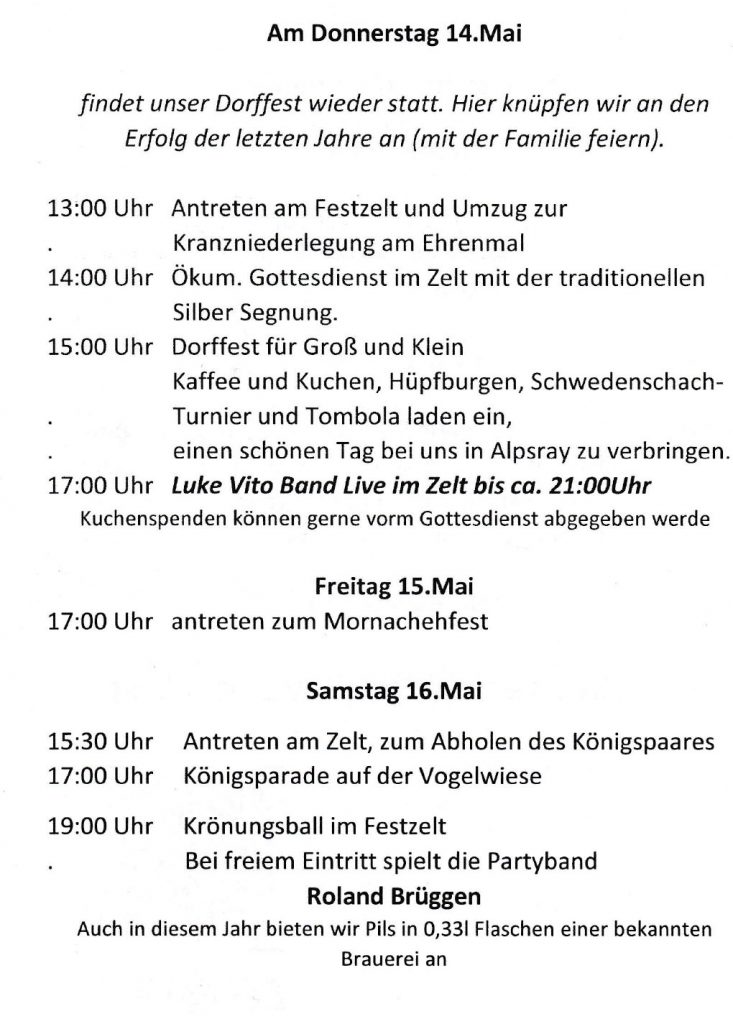 1997 war es nach etwas holpriger Bauphase und richtig viel Eigeninitiative soweit. Das neue Alpsrayer Bürgerzentrum wurde eingeweiht, mit gemütlicher Gaststätte, großem Saal, 2 Kegelbahnen, einem Vereinsraum, Biergarten und einem Schießstand für Luftgewehre, was besonders die Schützenbruderschaft freute.