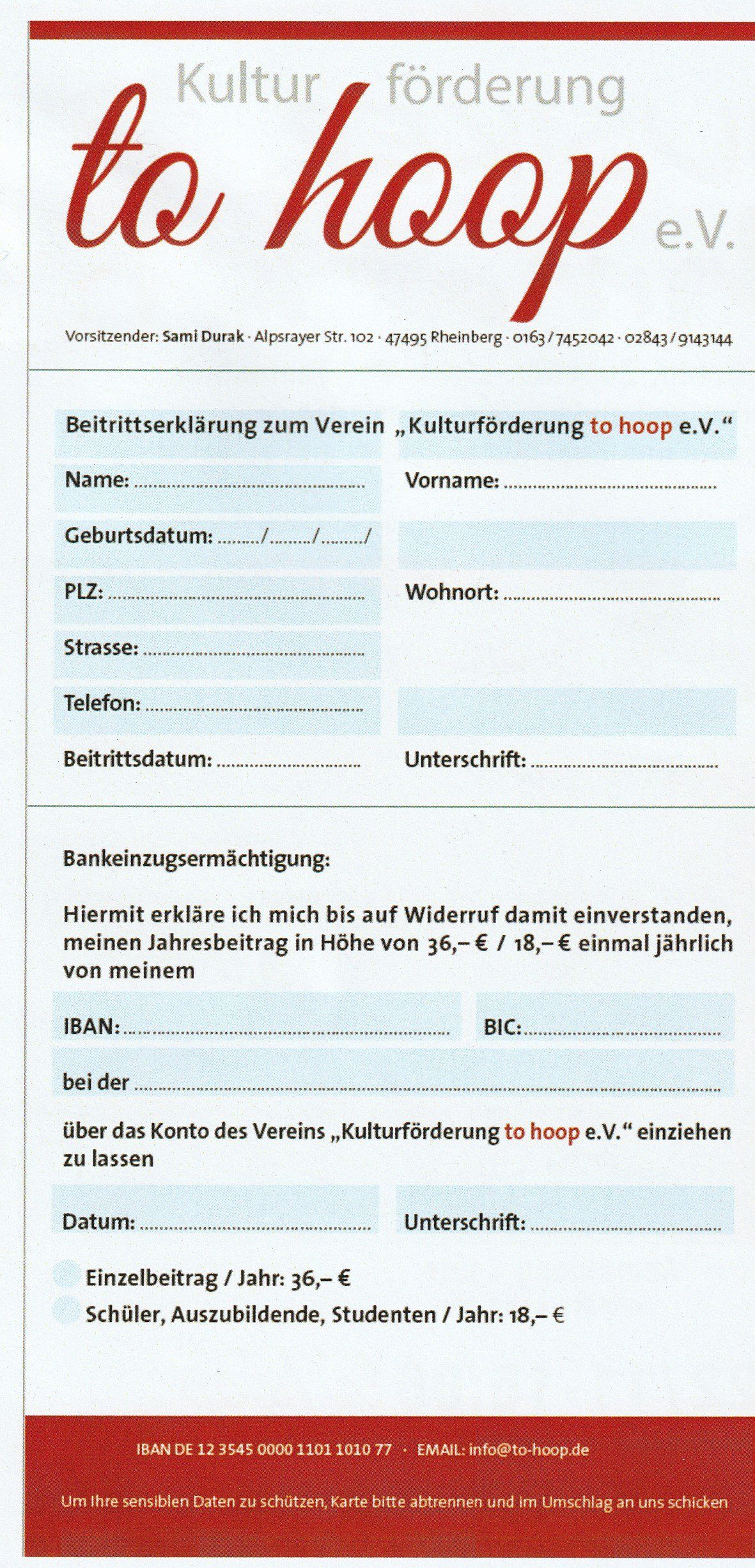 Weitere Aufgaben des Vereins sind die Förderung und Verbreitung der Musik-, Literatur- und Theaterkultur in Rheinberg und Förderung des “to hoop“ als Veranstaltungsort für ergänzende satzungsgemäße Kulturveranstaltungen, als zentralen Treffpunkt, Veranstaltungs- und Experimentierort für eine Vielzahl kultureller Gruppen, Format “Kultur-Kneipe“. Hierbei strebt der Verein eine aktive Zusammenarbeit mit lokalen kulturellen Einrichtungen und Kulturschaffenden an.
